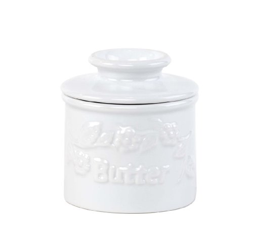 The original Butter Bell crock keeps butter soft, delicious and spreadable for up to 30 days without refrigeration. Through the study of traditional and historical butter storage methods and hours of product development, L. Tremain, Inc. has created a line of butter crocks that are a tribute to the original French butter crock or "beurrier" (pronounced bur-e-ay). Made from durable stoneware or dolomite clays, the Butter Bell crocks will safely keep butter fresh and spreadable without refrigeration, odors or spoilage. The Butter Bell's unique design enhances butter's delicate flavor, while providing a practical and decorative solution for storing and serving butter. It keeps butter at the perfect "spreading" consistency by reflecting outside heat while insulating and cooling the butter. Flavor and freshness is protected by an airtight seal of water at the base of the crock. Water should be changed out every three days and replaced with fresh, cold water. Store the crock away from heat or sunlight. To use, firmly pack softened butter into the bell-shaped lid, pour cold water into the base of the crock and place the lid upside down back into the base of the crock. The white raised floral Butter Bell crock is a traditional white crock decorated with a raised floral pattern and features the word "Butter" on one side and "Beurre" on the other. This classic crock can go from the kitchen to the tabletop. Dishwasher safe.