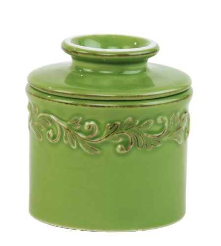 The original Butter Bell crock keeps butter soft, delicious and spreadable for up to 30-day without refrigeration. Through the study of traditional and historical butter storage methods and hours of product development, L. Tremain, Inc. has created a line of butter crocks that are a tribute to the original French butter crock or "beurrier" (pronounced bur-e-ay). Made from durable stoneware or dolomite clays, the Butter Bell crocks will safely keep butter fresh and spreadable without refrigeration, odors or spoilage. The Butter Bell's unique design enhances butter's delicate flavor, while providing a practical and decorative solution for storing and serving butter. It keeps butter at the perfect "spreading" consistency by reflecting outside heat while insulating and cooling the butter. Flavor and freshness is protected by an airtight seal of water at the base of the crock. Water should be changed out every three days and replaced with fresh, cold water. Store the crock away from heat or sunlight. To use, firmly pack softened butter into the bell-shaped lid, pour cold water into the base of the crock and place the lid upside down back into the base of the crock. This antique vert green colored Butter Bell features a decorative embossed pattern that is hand-distressed to create a well-worn look. It is a beautiful addition to any kitchen or tabletop. Dishwasher safe.