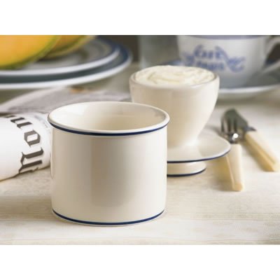 - Modeled after original French butter crock; glazed in a creamy white color with rich blue banding around edges and bottom